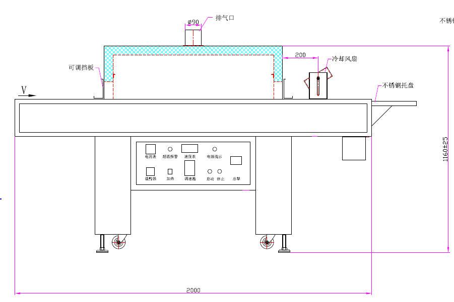 3、采用無級調速 | 4、輸送材料:不鏽鋼網帶 |